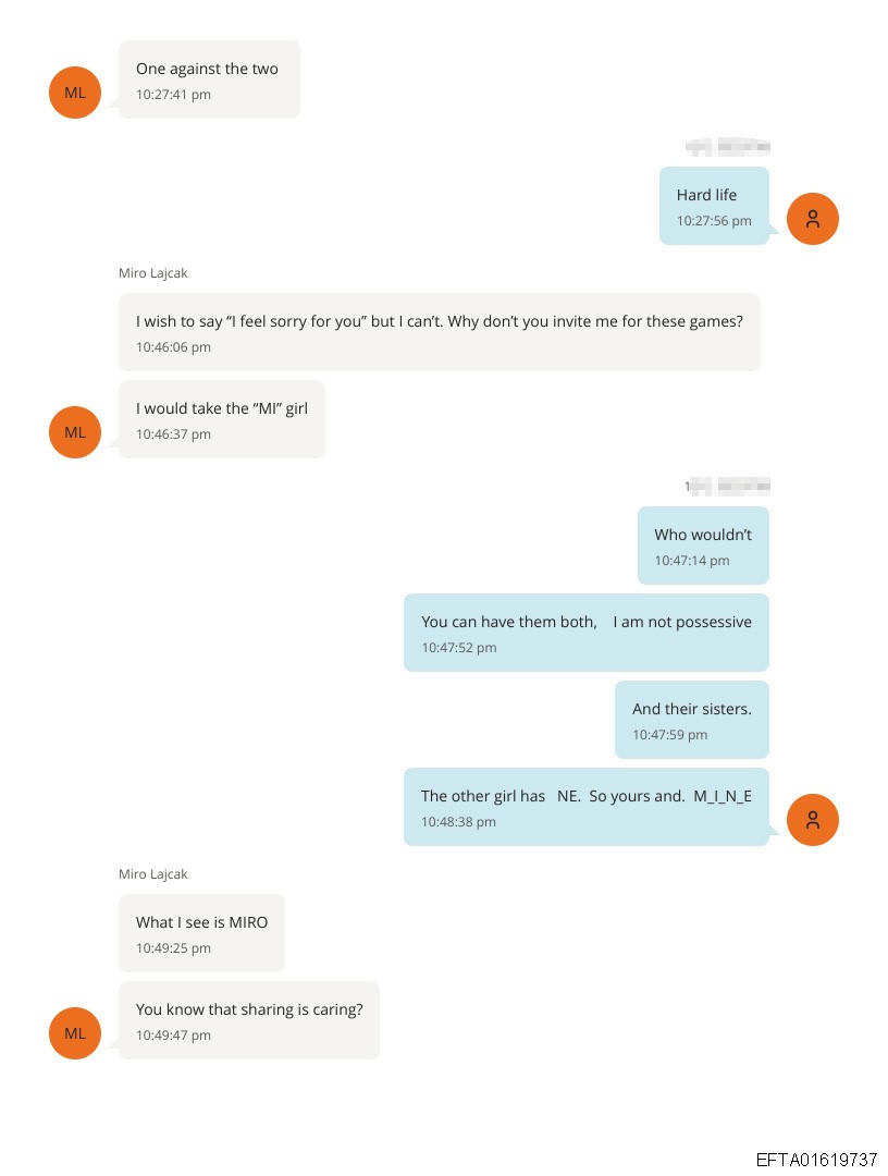 ABD Adalet Bakanlığı’ndan yayınlanan yaklaşık 3 milyon sayfalık evraklarda Ekim 2018 tarihinde Lajcak ve Eptstein ortasında bayanlar ve Slovak diplomatın Rusya Dışişleri Bakanı Sergey Lavrov ile yakın vakitte gerçekleştireceği görüşmeye ait yazışmalar yer aldı. Epstein’in Lajcak’a gönderdiği evraklarda belirtilmeyen fotoğraflı iletinin akabinde Slovak siyasetçinin, “Neden beni bu tıp oyunlara davet etmiyorsun” diye sorduğu kaydedildi.